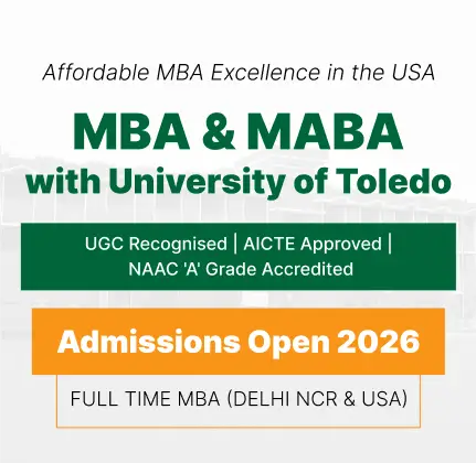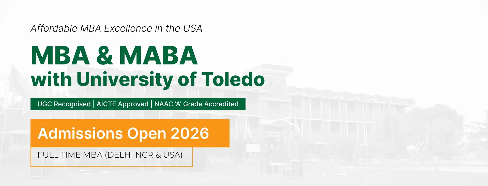 This is a 2 year program. Study 1st year in SHOBHIT B School Noida and 2nd year in University of Toledo USA. After completing the program, get Full Time MBA/ Masters of Applied Business Analytics (MABA) from University of Toledo USA with up to 3 years of work permit.